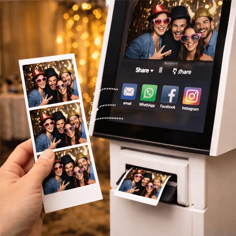 Photos can be instantly printed on-site or shared via email, WhatsApp, or social media directly from the booth.