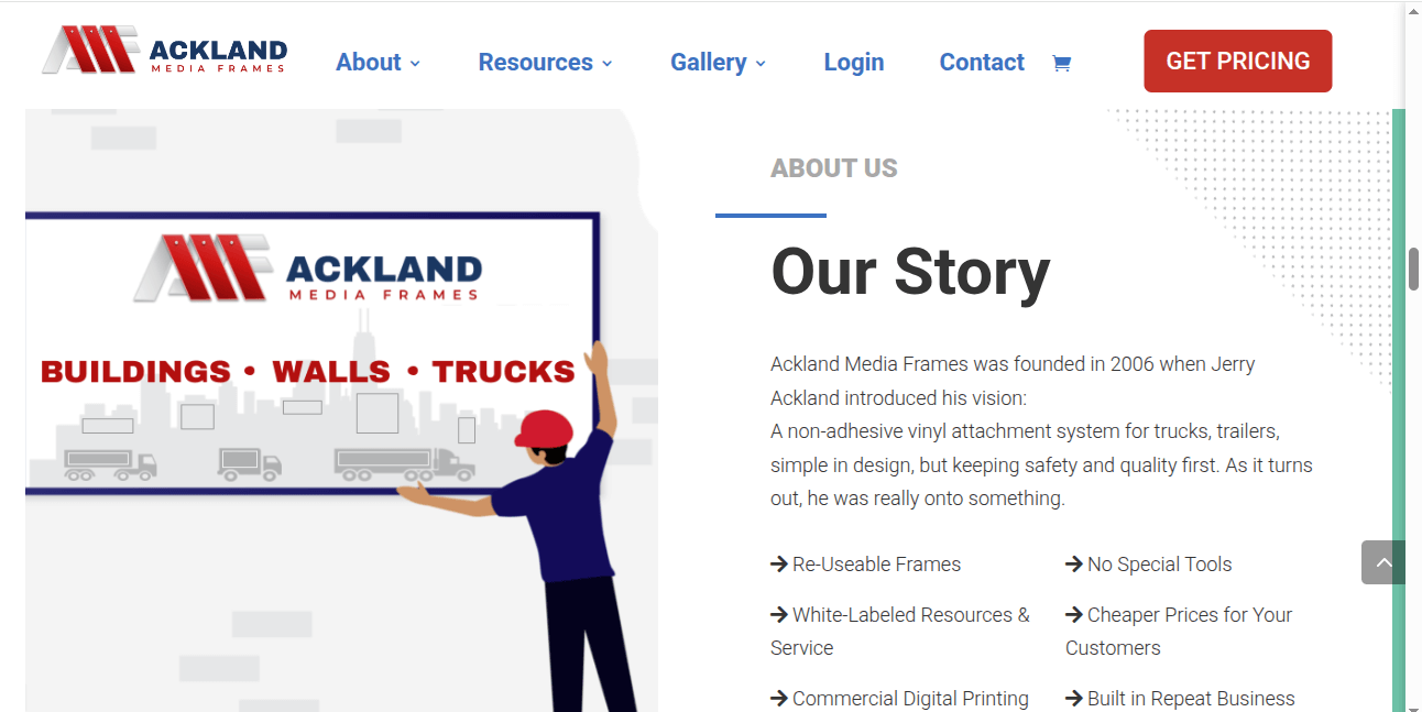 A clean and professional website designed to showcase Ackland’s large-format media frames and visual branding solutions. Focused on product display, easy navigation, and lead generation.