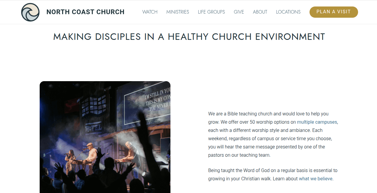 A vibrant website for North Coast Church, built to engage a wide audience across multiple campuses. Features include sermon streaming, event calendars, giving tools, and location-specific content.